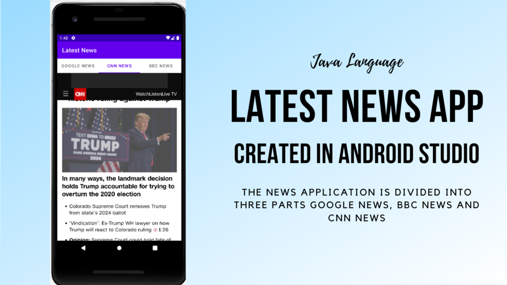The news application is divided into three parts google news, bbc news and cnn news, created in android studio